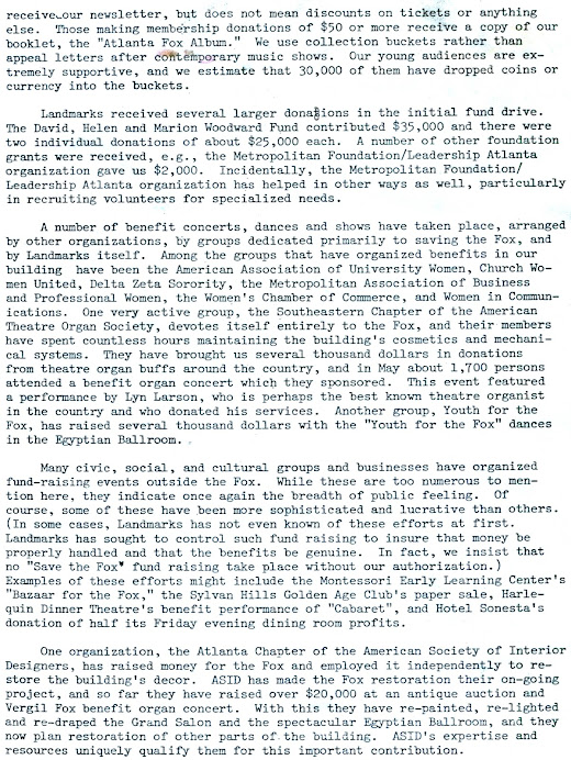 This 17-page pitch made by Landmarks to Boisfeuillet (BOO-FILET) Jones, then of the Whitehead Foundation, provides a fascinating and unretouched snapshot of the Fox and the struggle to save it. Jones was best known as the money-giver for Mr. Woodruff of Coca-Cola fame, "Mr. Anonymous."